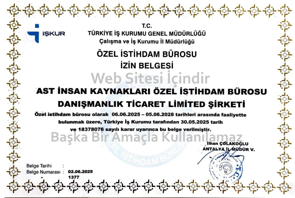 AST İnsan Kaynakları Özel İstihdam Bürosu Eğitim Danışmanlık Tic. Ltd. Şti, İşkur 02/06/2025 tarih ve 1377 ruhsat numarası ile istihdam bürosu bünyesinde faaliyet göstermektedir.4904 sayılı Türkiye İş Kurumu Kanunu’nun 19. maddesi gereği iş arayanlardan hiçbir ücret talep edilmemektedir.